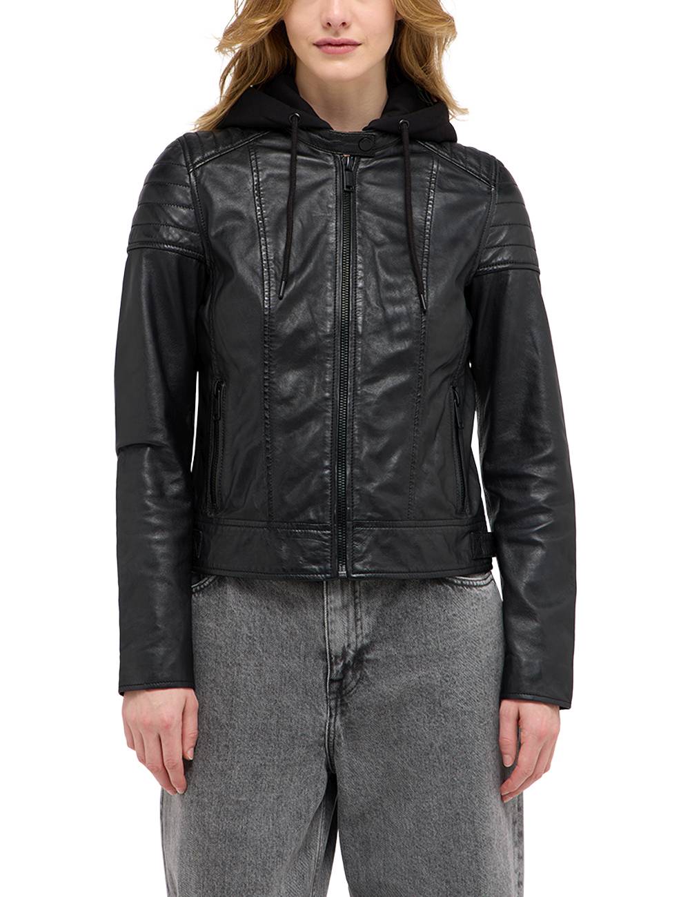 Diese Lederjacke von Mustang im lässigen Biker-Style ist ein Muss für alle, die einen rebellischen Look lieben. Das coole Design wird durch markante Details wie Steppungen, Teilungsnähte und verstellbare Riegel am Saum perfekt ergänzt. Egal ob mit Slim-fit-Jeans und Sneakern oder zum Kleid und Boots – diese Jacke verleiht deinem Outfit das gewisse Etwas.