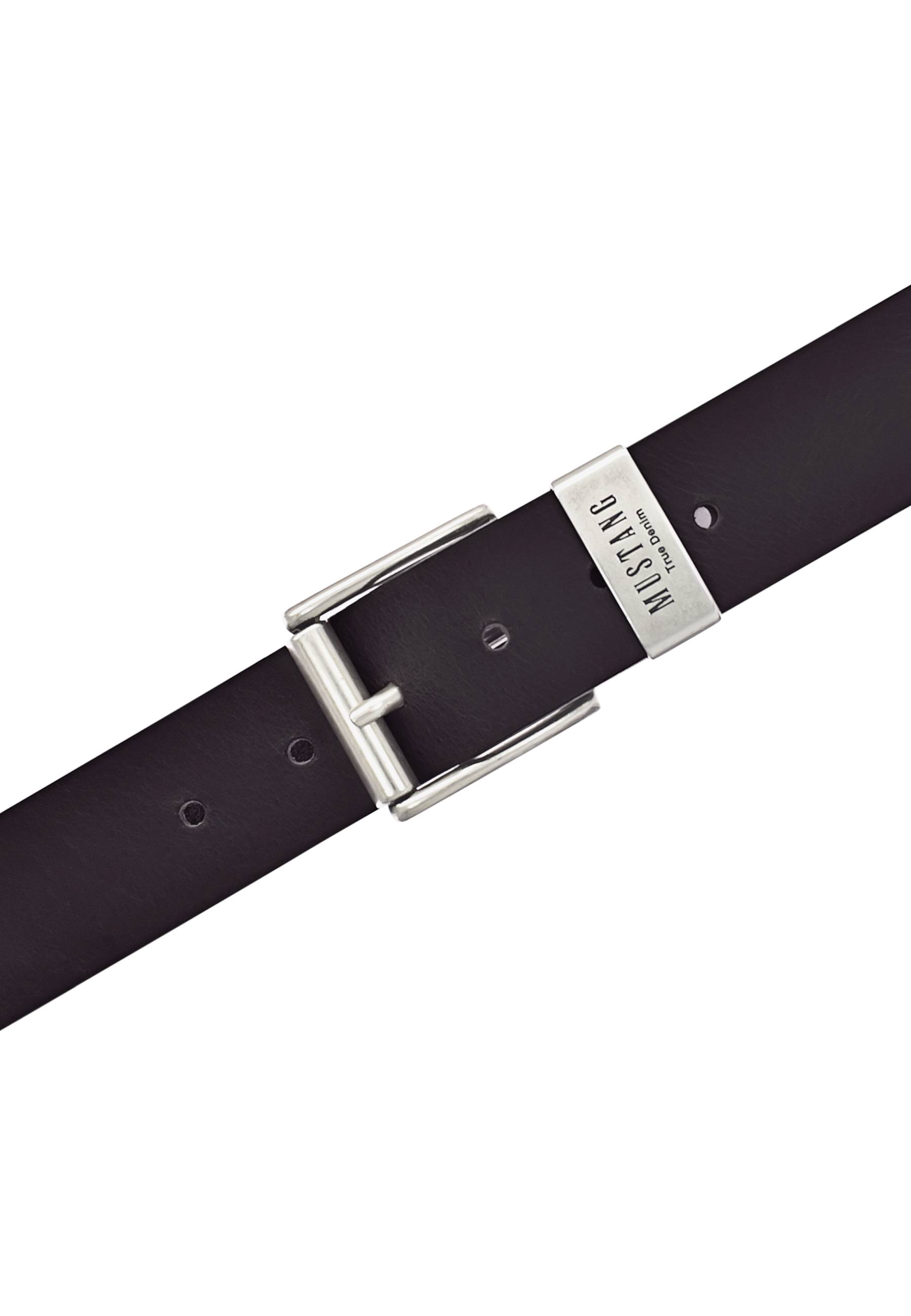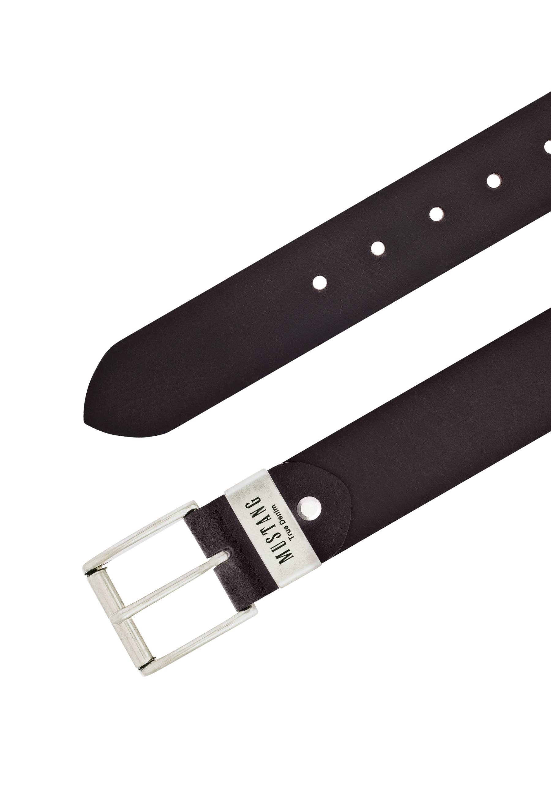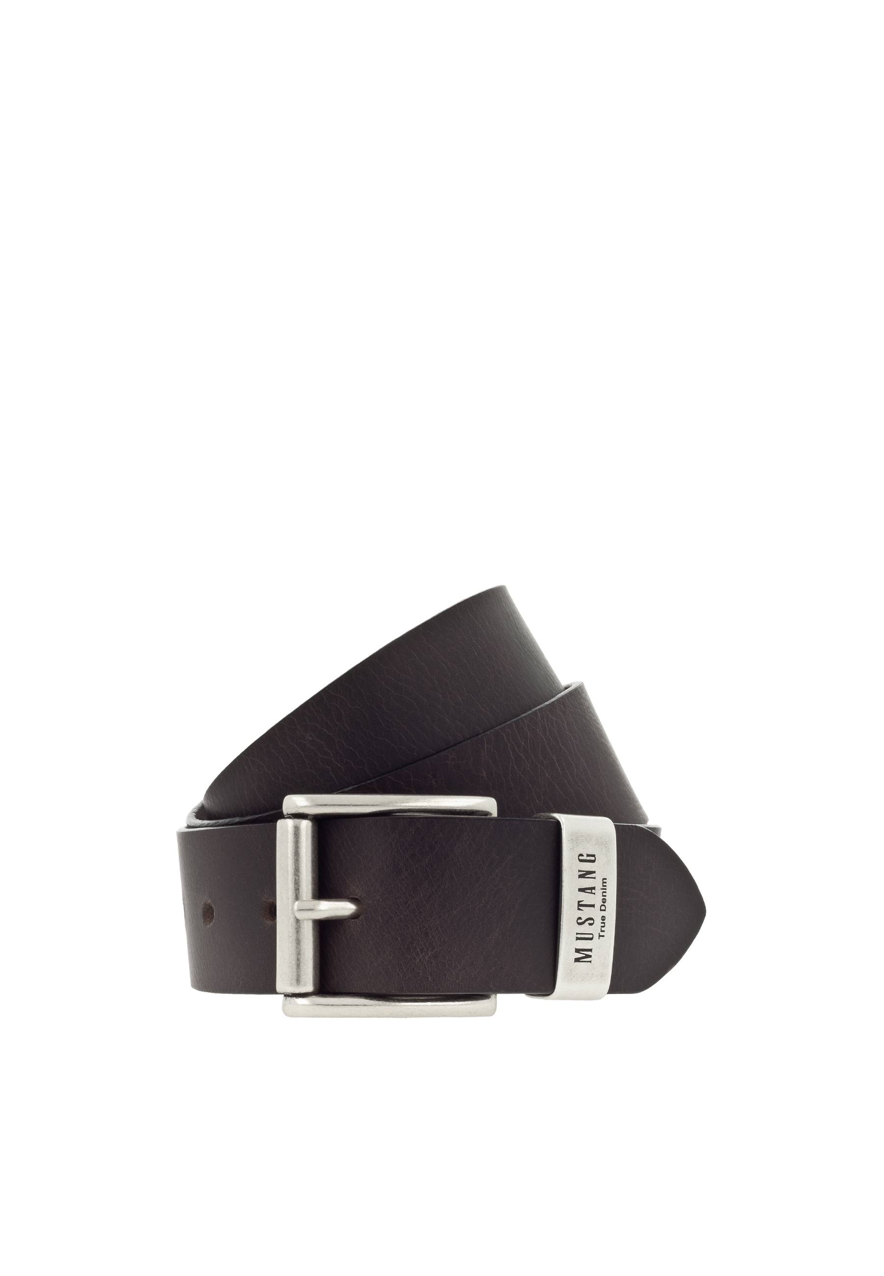 Unser Mustang Vollledergürtel besticht durch seinen dezenten Look. Er ist 40 mm breit und zeigt sich mit einer Metallschlaufe und Schließe in poliertem Silber. Die fein gearbeitete Logo-Prägung runden den stilvollen Gürtel ab, der durch den zurückhaltenden Stil genauso zu Jeans wie zu Anzügen getragen werden kann.