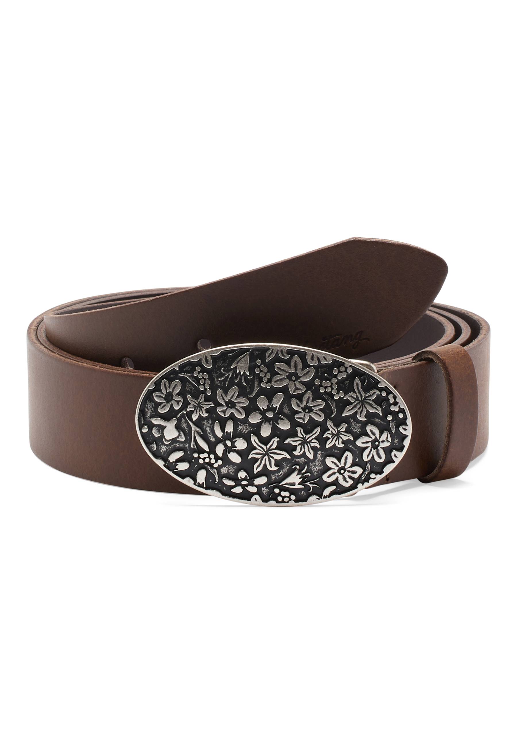 Setzt doch mal deine Taille mit diesem Ledergürtel von Mustang in den Blickpunkt. Er besteht aus hochwertigem Leder und fällt durch die raffiniert gestaltete Zierschnalle sofort ins Auge. Filigran mit Blumenmuster bearbeitet, ist die besondere Buckle ein wahrer Blickfang. Style den Gürtel am besten zu deinen Lieblingsjeans. Bluse und Western-booties dazu und du bist bestens gerüstet für nahezu jeden Anlass.