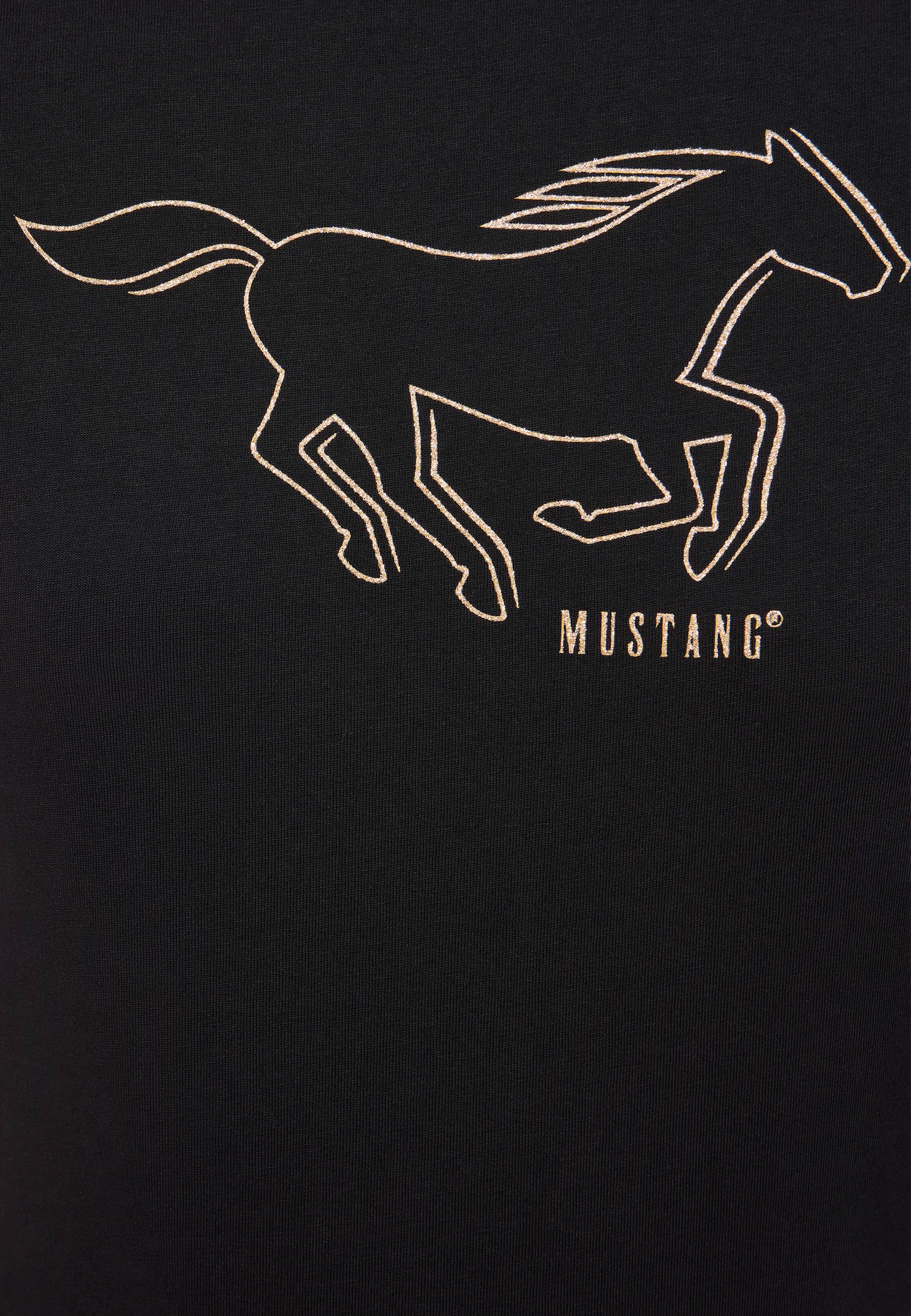 Dieses T-Shirt von Mustang überzeugt mit einem klassischen Rundhalsausschnitt, kurzen Ärmeln und einem geraden Saum. Weiche Baumwolle sorgt für hervorragenden Tragekomfort. Ob zu Skinny-Jeans und Sneakern oder mit Rock und Stiefeln – es passt perfekt zu deinen Lieblingslooks.