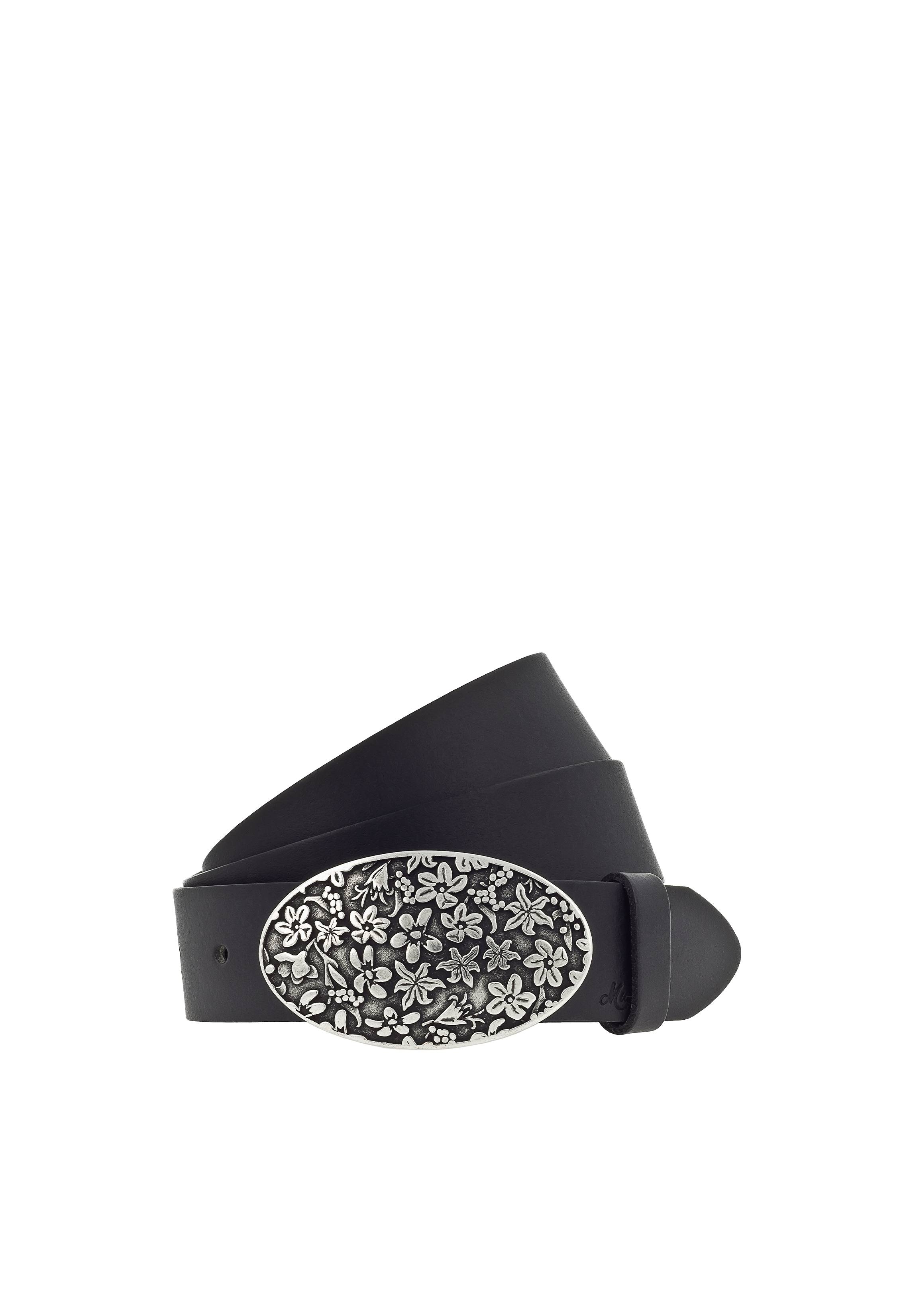 Welcome to Wild-West heißt es mit diesem Ledergürtel von Mustang. Einen Hauch von Country-Flair versprüht die aufwendig mit Blumenmustern gearbeitete Buckle im Cowboy-Stil. In poliertem Silber gearbeitet ist sie das Herzstück des Gürtels und zieht sämtliche Blicke auf sich. Trage sie zu coolen Jeans und einer Bluse im Karo-Look für den perfekten Style!