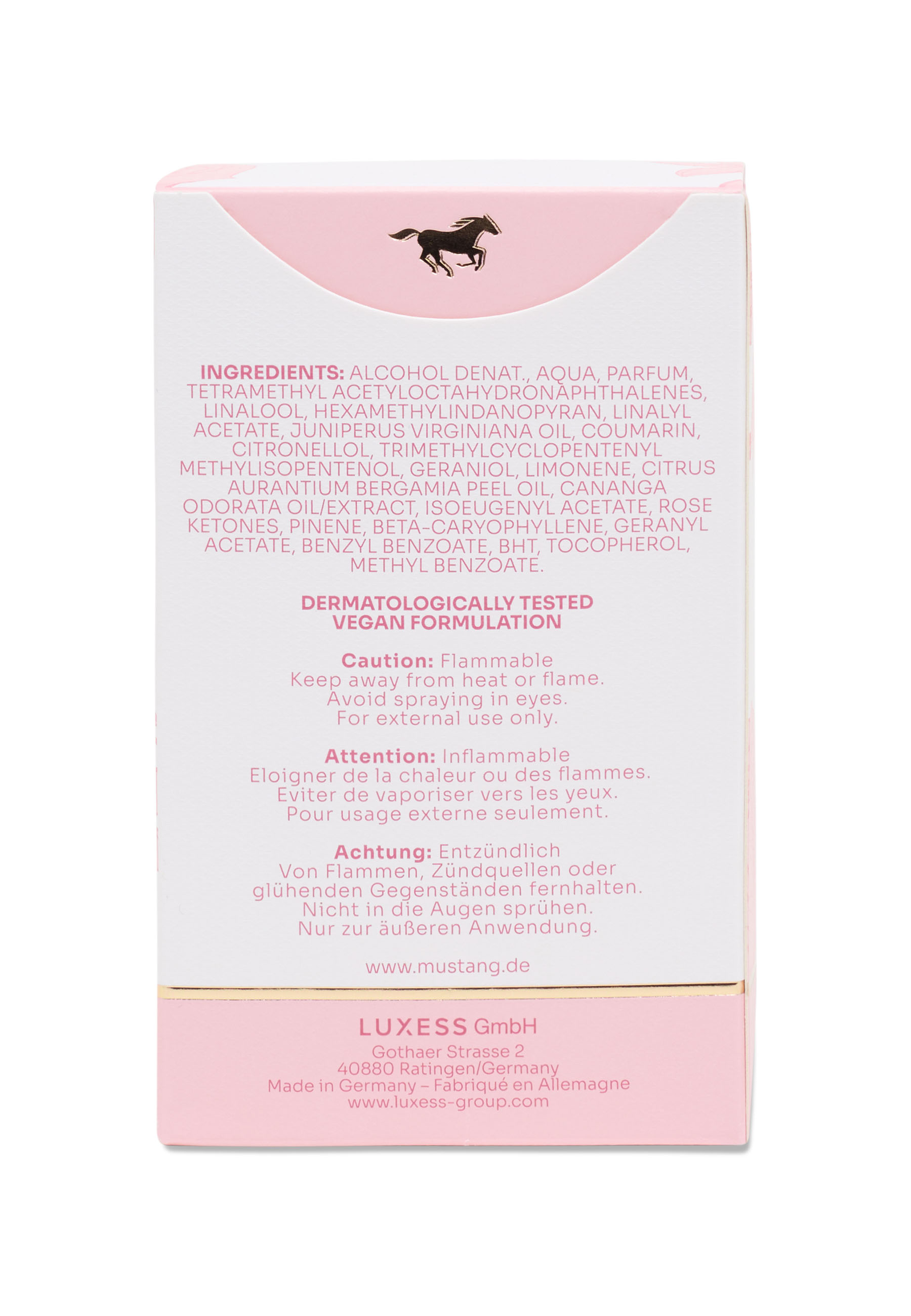 MUSTANG WILD BLOSSOM NECTAR ist wie ein Abendhimmel in sanften Gold- und Rosétönen. Bananenblüte, Kardamom und Mandarine eröffnen den Duft mit einer leichten, fruchtigen Frische, die an das letzte Strahlen der Sonne erinnert. Im blumigen Herzen aus Orangenblüte, Maiglöckchen und Rose verschmelzen Wärme und Zartheit, während Moschus, karamellisiertes Benzoe, Sandelholz, Amber und solare Noten die Stimmung von sanft sinkendem Licht und endloser Leichtigkeit einfangen. Ein Duft verspielt, strahlend und voller Magie der goldenen Stunde. Inhaltsstoffe: ALCOHOL DENAT., AQUA, PARFUM, TETRAMETHYL ACETYLOCTAHYDRONAPHTHALENES, LINALOOL, HEXAMETHYLINDANOPYRAN, LINALYL ACETATE, JUNIPERUS VIRGINIANA OIL, COUMARIN, CITRONELLOL, TRIMETHYLCYCLOPENTENYL METHYLISOPENTENOL, GERANIOL, LIMONENE, CITRUS AURANTIUM BERGAMIA PEEL OIL, CANANGA ODORATA OIL/EXTRACT, ISOEUGENYL ACETATE, ROSE KETONES, PINENE, BETA-CARYOPHYLLENE, GERANYL ACETATE, BENZYL BENZOATE, BHT, TOCOPHEROL, METHYL BENZOATE Warnhinweis: Entzündlich. Von Flammen, Zündquellen oder glühenden Gegenständen fernhalten. Verwendungshiweis: Nicht in die Augen sprühen. Nur zur äußeren Anwendung.